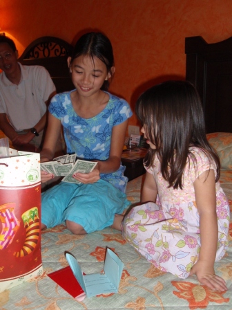 She wasn't sure what to do with the red envelope, so Elena helped her count her cash. Aurora was much more "into"