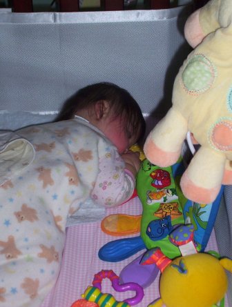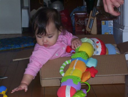 Aurora plays in a box. Notice how she can reach out to get the rattle she dropped.