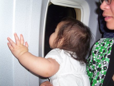 November 28: On the plane going home! Aurora liked looking at the lights outside the window.