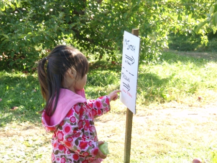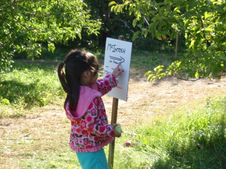 Reading the sign to see where the different kinds of apples can be found.