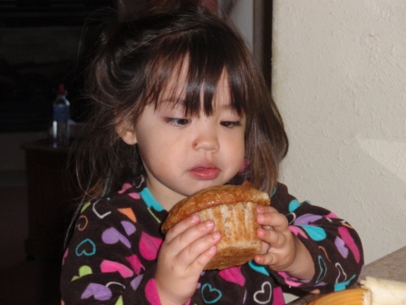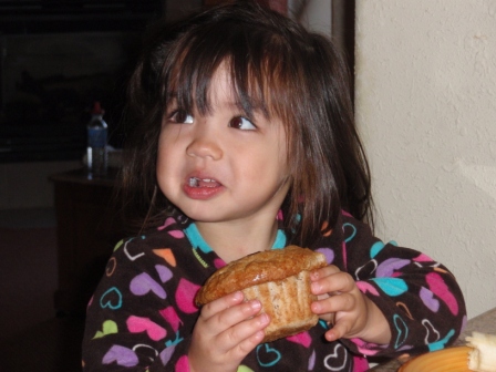 kitchen, fireplace and balcony. Here Jon is introducing Aurora to her first bran muffin - she