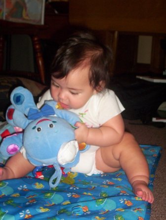 September 14: Back in Newton, Aurora enjoys her toys. She also (angrily) shows off her first tooth.