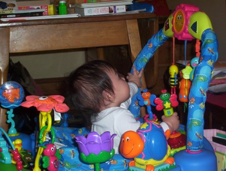 September 7: Aurora is really playing with all the parts to the Exersaucer now!