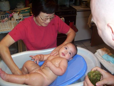 September 13: In Yorktown, Wai Pao gives Aurora a morning bath.