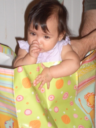 Mama's coworkers chipped in and got Aurora lots of clothing, which came in this giant gift bag. At home, Aurora is