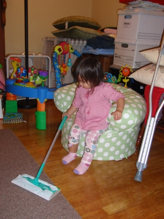Aurora likes doing what we do, even if it is housework! Here she is Swiffering the living room (rug).