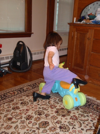 trying on our shoes and walking all over the house with them on. Here she is proving that women can do