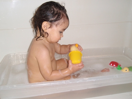 we were in Asia this summer, she had the opportunity to take her first baths in a tub - and she loved it,