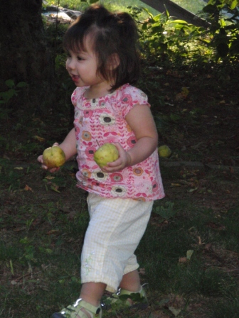 While Mama raked leaves, Aurora helped Baba pick apples from our trees.