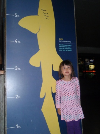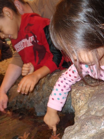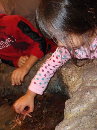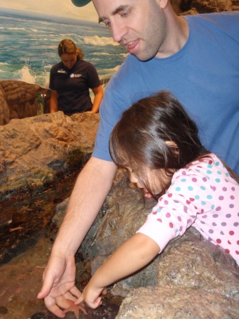 Aurora at the tidepool touch tank. This time she's willing to touch a seastar.