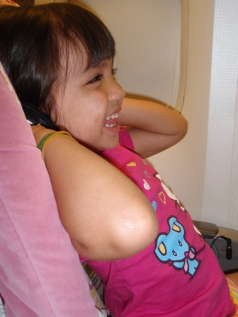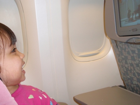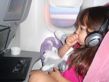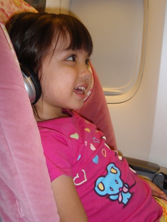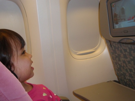 On the plane, everyone got their own video screen. Aurora enjoyed Pingu so much she watched it 2 times in a row.