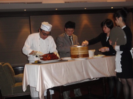 The Peking duck gets carved and a shot of the huge birthday cake, a present from President Ma to Nai Nai.