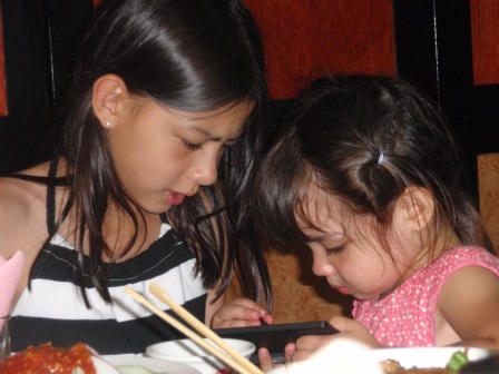 Dinner at Nai Nai's. Aurora and Wai Po play with an orchid that fell off one of the plants. Don't they look pretty?